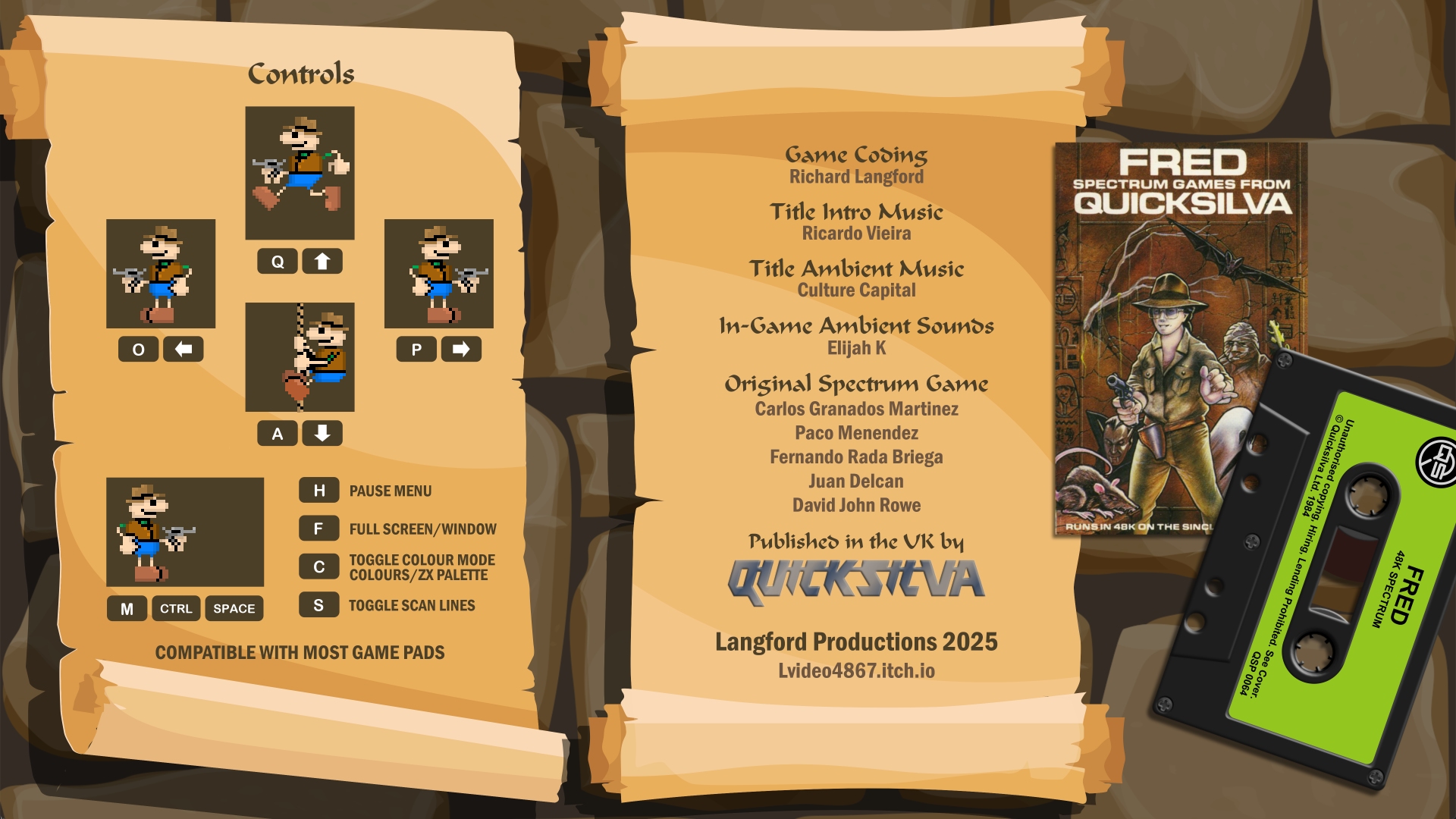 The game offers display options including full colour or classic Spectrum palette, optional scanlines, and a choice between fullscreen or windowed mode.
